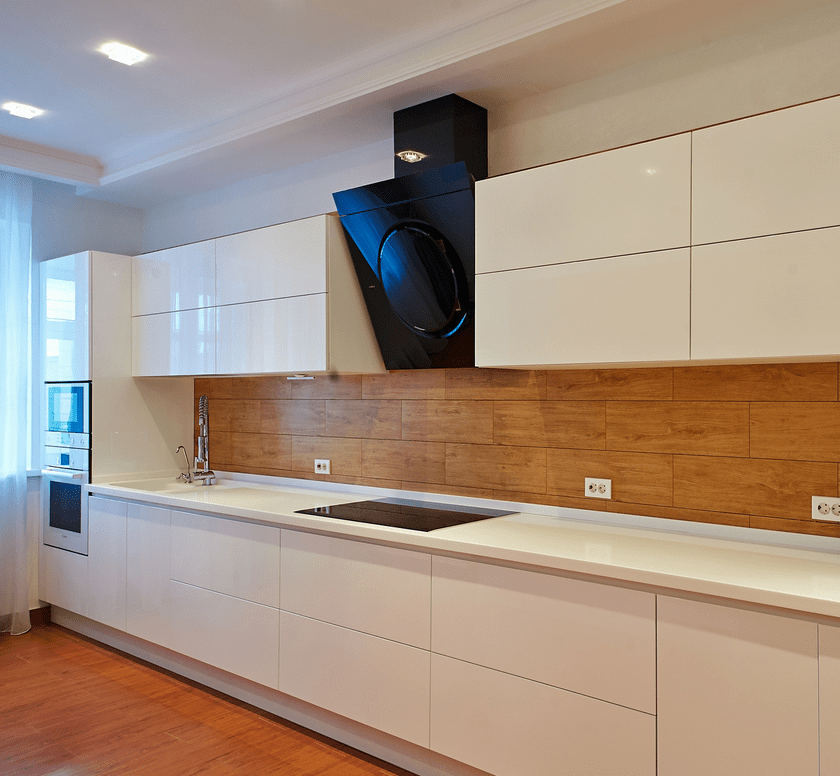 Прямая кухня – самый лучший вариант планировки, подходящий для любых помещений. Если длина хотя бы одной кухонной стены составляет не меньше 3 метров, вы можете смело выбирать такой вариант – линейная кухня позволит вместить всю необходимую технику, посуду.