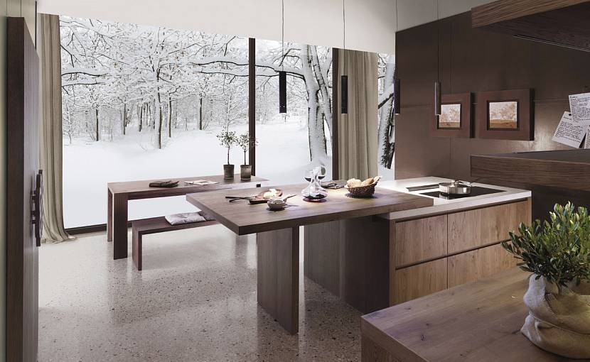 Что касается размещения обеденного модуля, то тут все зависит от площади помещения. В просторной широкой кухне полноценный большой стол со стульями станет комфортным местом для всей семьи.