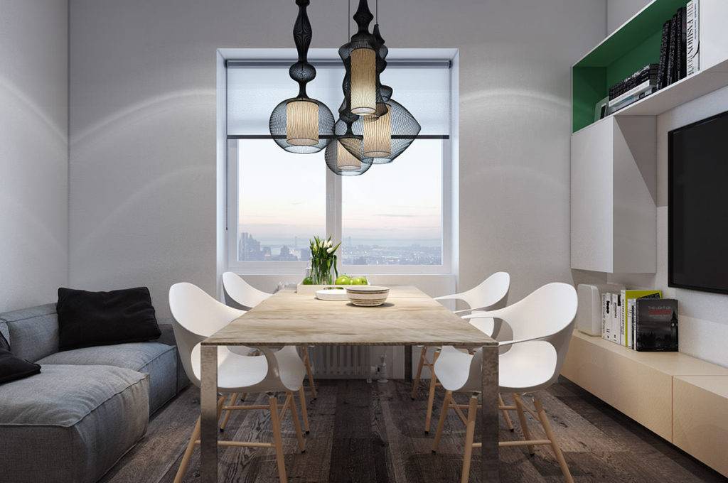 Сразу же должна быть разделена на две зоны. Причем обеденный стол будет уместен в части, которая ближе к выходу, но не мешал передвижению по комнате. Диванная часть может располагаться перпендикулярно и дополнительно обозначаться при помощи ковра.
