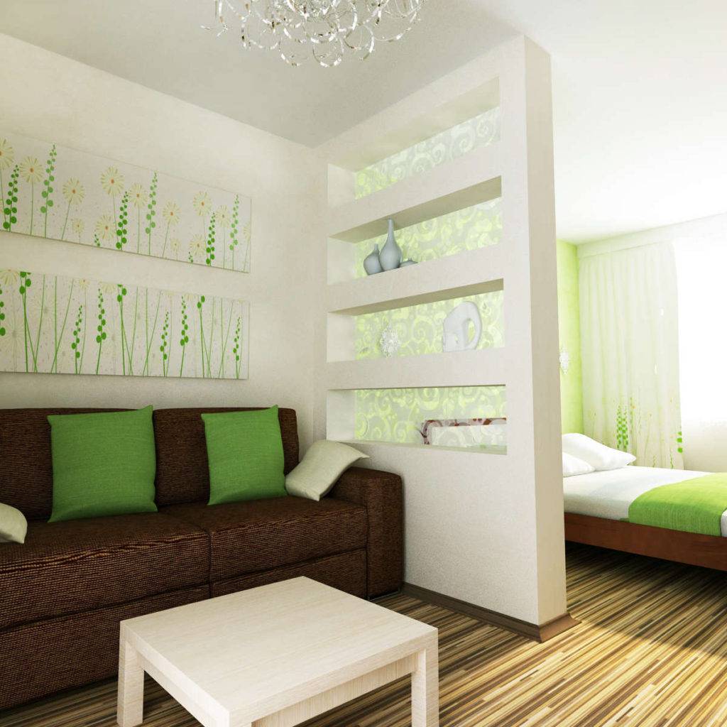 Маленькая площадь требует разумного обращения с цветовой палитрой. Если спальня будет более уютной и расслабляющей при темном оформлении, то гостиная покажется более просторной в светлой гамме. Можно, конечно, выбрать комбинированное оформление, но тогда следует учесть, что визуально площадь комнаты будет еще меньше. Выход один – выбрать светлый диапазон.