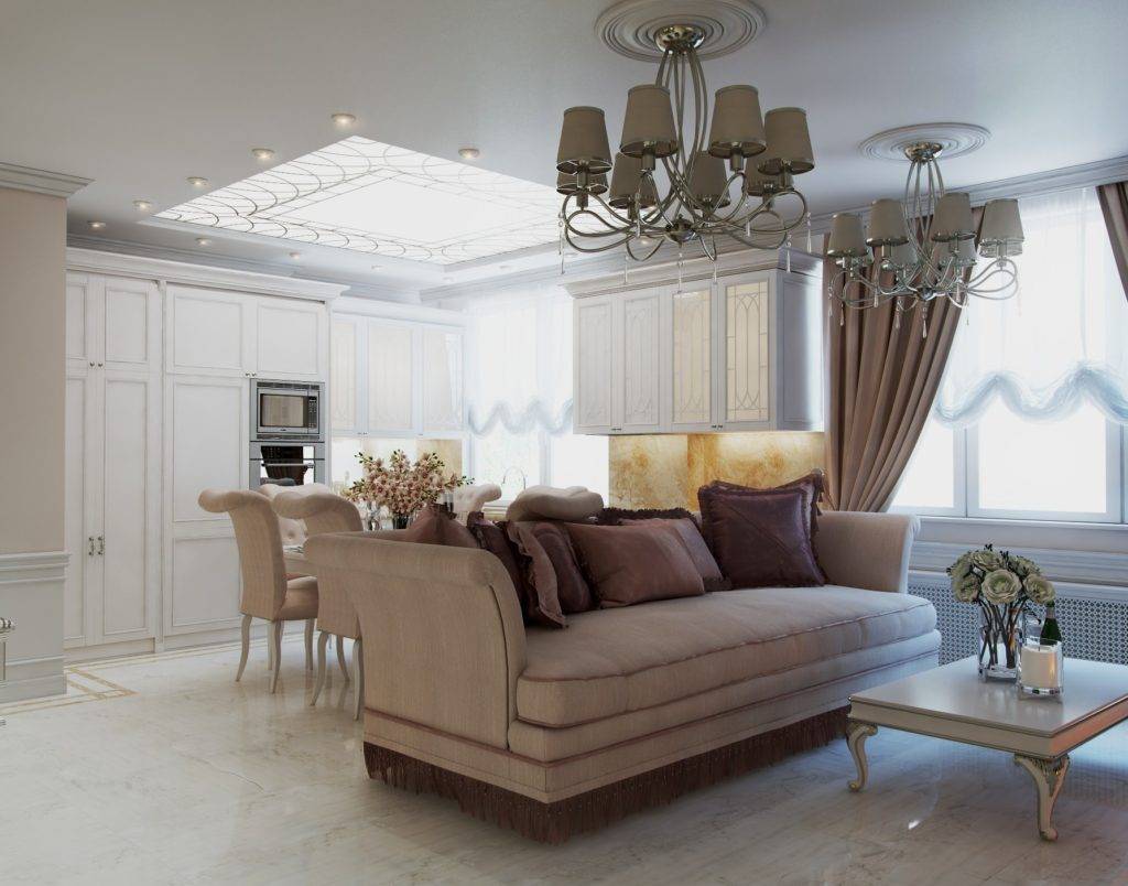 Идеальный фундамент для реализация других современных стилей дизайн в кухне-гостиной.