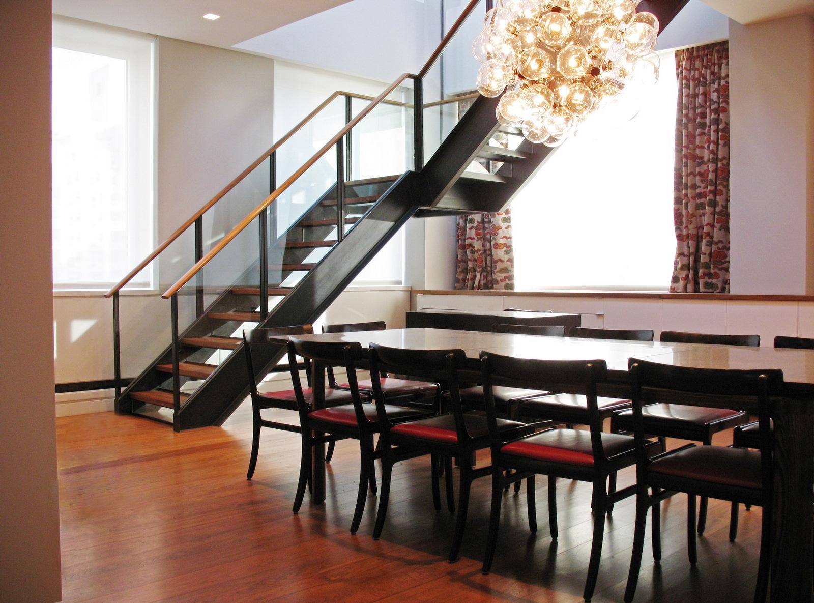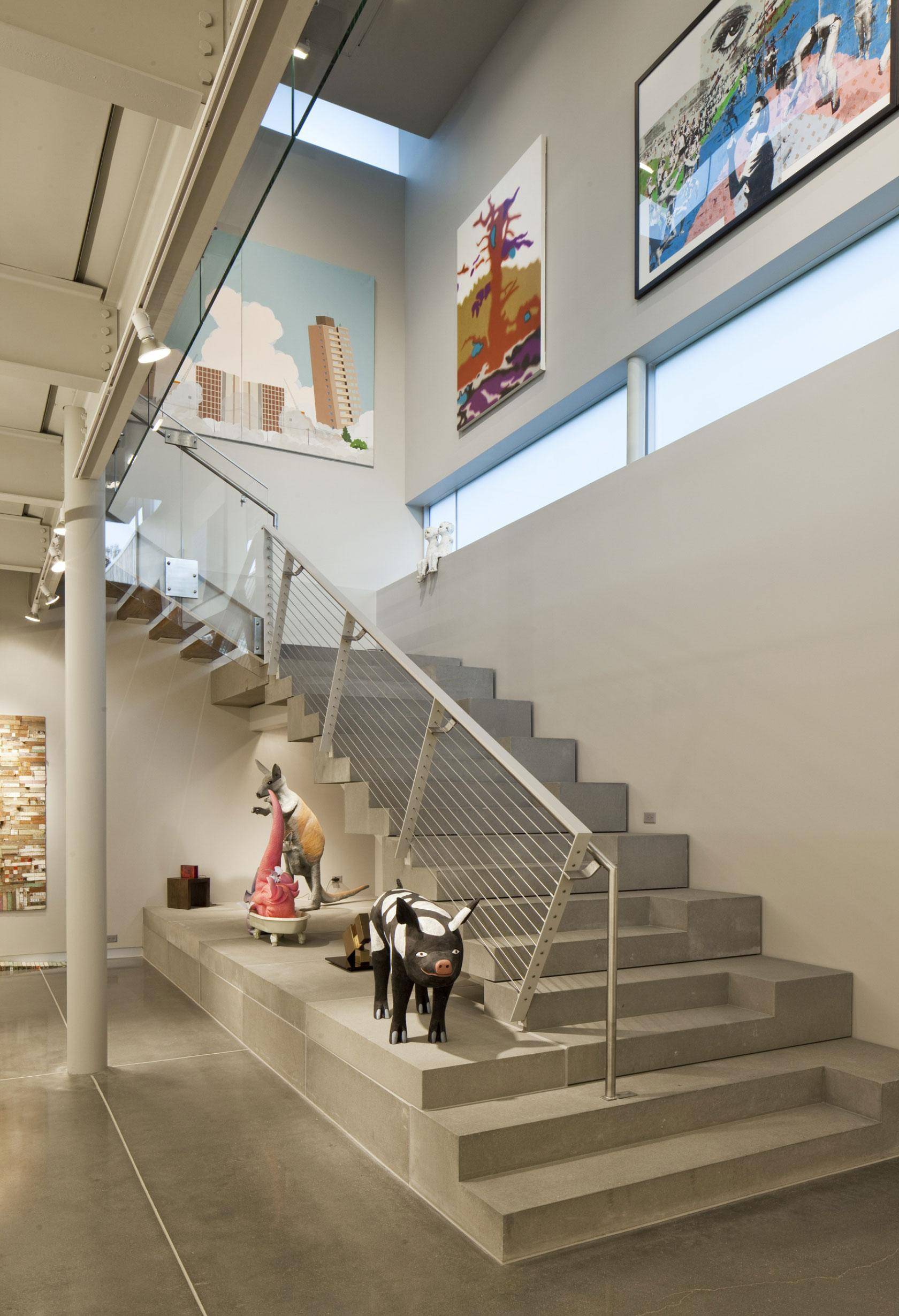 Для индустриального стиля подойдут грубые поверхности. Например, можно подобрать лестницу из черного металла с крупными деревянными ступеньками, сочетающимися по оттенку с полом и другим деревом в интерьере.