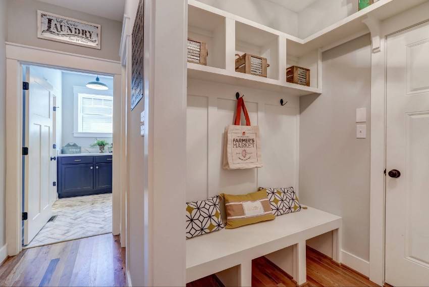 В таком помещении максимально нужно воспользоваться местом над входной дверью и возле нее. С обеих сторон стоит расположить узкие системы для хранения, а сверху – антресоль.