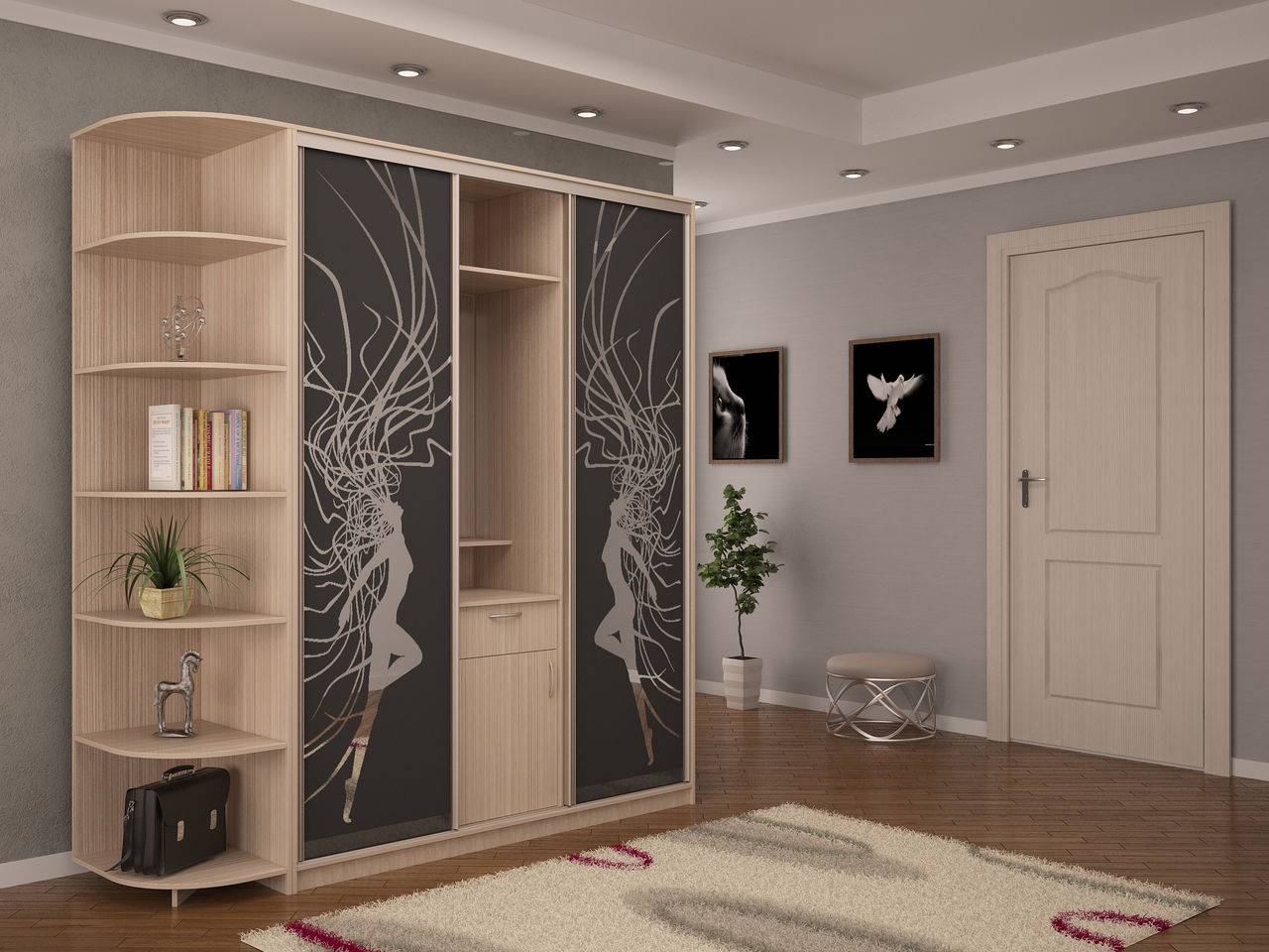 Шкаф-купе — оптимальный вариант для узкого коридора. За счёт роллерной дверной системы значительно экономится пространство, обычно необходимое для комфортного открывания распашных дверей. Раздвижные створки часто делаются зеркальными, а для декора используется, например, пескоструйная роспись по стеклу.