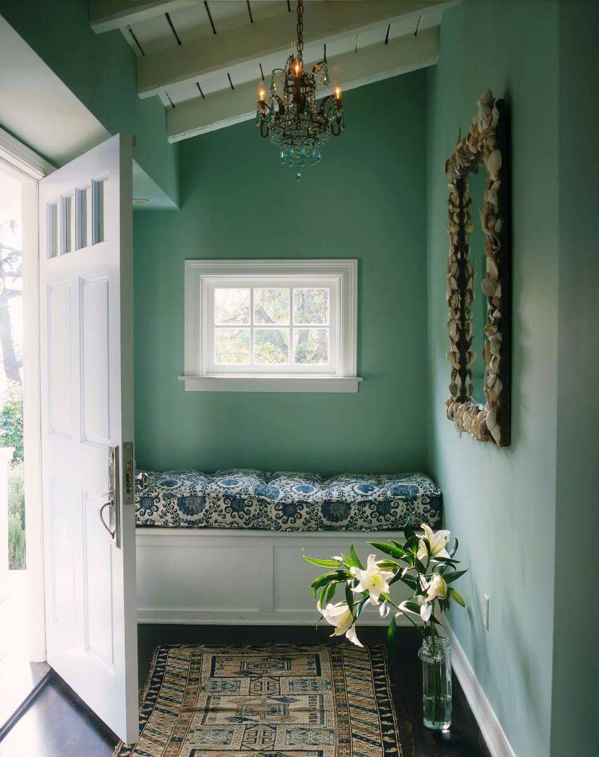 Первостепенный цвет стиля — это белый, делающий прихожую предельно светлой. Белый цвет в интерьере можно сочетать с бежевым, лазурным, светло-зелёным или светло-пепельным.
