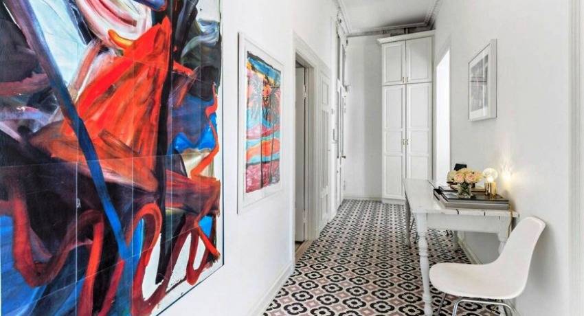 Если мебель выбирается в белом цвете, тогда стены желательно оформить с помощью яркого оттенка, что создаст эмоциональную атмосферу в помещении, заметно оживив его. Узор на стенах или броский принт можно использовать в небольших помещениях в одиночном исполнении, что наглядно демонстрируют фото дизайна узких прихожих.