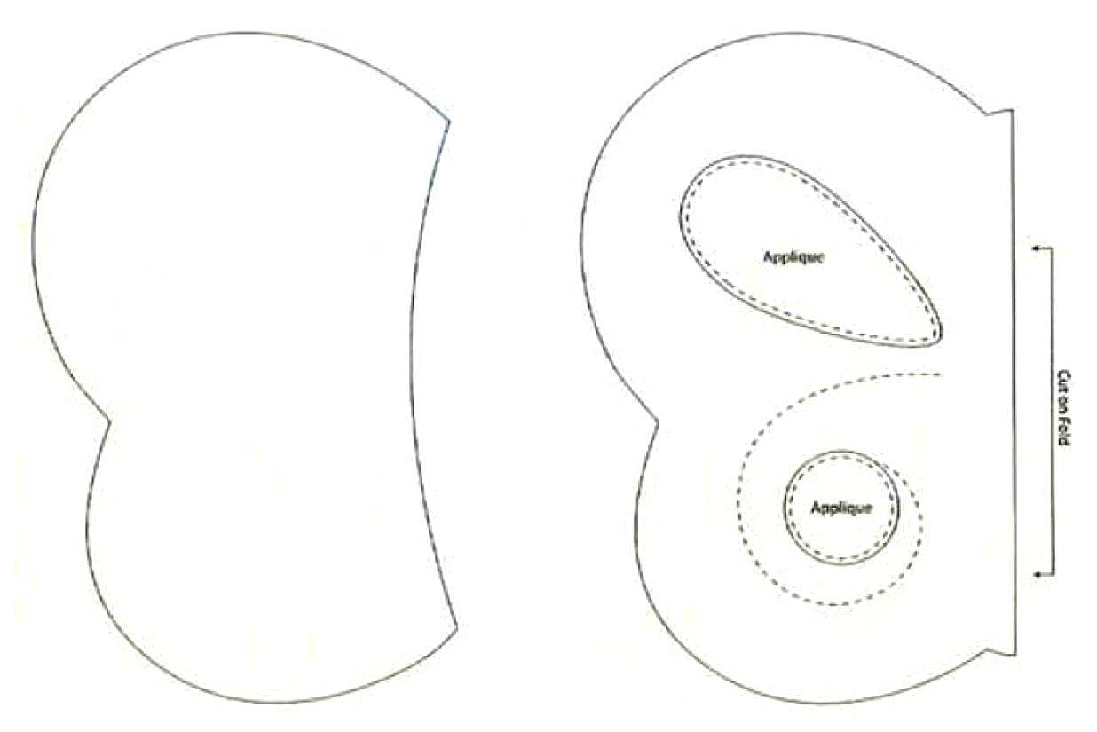 Для аппликации на крыльях вырезаем деталь в виде капли с припусками 5 мм. Пришиваем её ручным швом. Для второго украшения выкраиваем круглую заготовку с помощью шаблона. Её диаметр должен быть в два раз больше, чем диаметр украшения в готовом виде. Размещаем заготовку и шаблон на крылышке, пристрачиваем по окружности.
