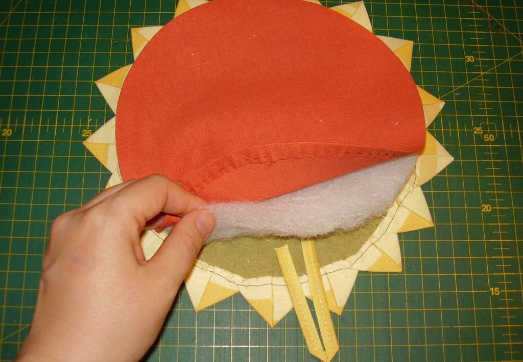 Если изделие будет сшиваться снаружи, первую заготовку из ткани для лицевой стороны кладут рисунком вниз, затем помещают 1–2 слоя наполнителя. Оставшуюся деталь располагают лицом наверх. Все слои сметывают и прострачивают на расстоянии 0,5 см от кромки, а затем обшивают косой бейкой или тесьмой, не забыв выполнить петельку. Таким способом края будут надежно закреплены, а также скроются все неровности, допущенные при работе.