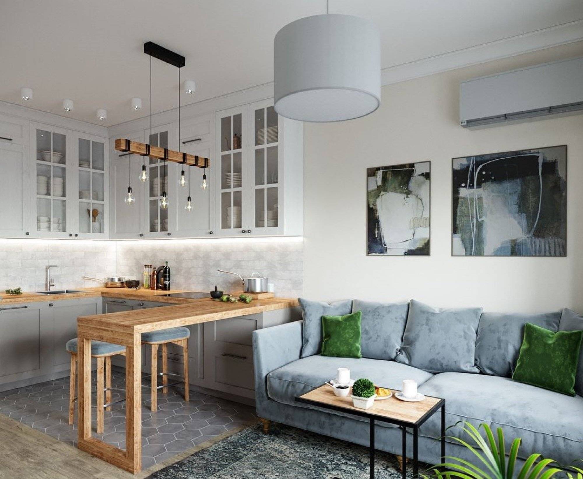 Вместо большого холодильника можно приобрести компактную холодильную камеру, вместо объемной плиты — варочную поверхность. Обеденный стол можно заменить барной стойкой, организовав планировку «полуостров».