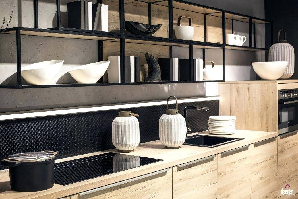 На кухне полки могут располагаться как в нижней части, так и в верхней. Таким образом, экономия пространства удваивается.