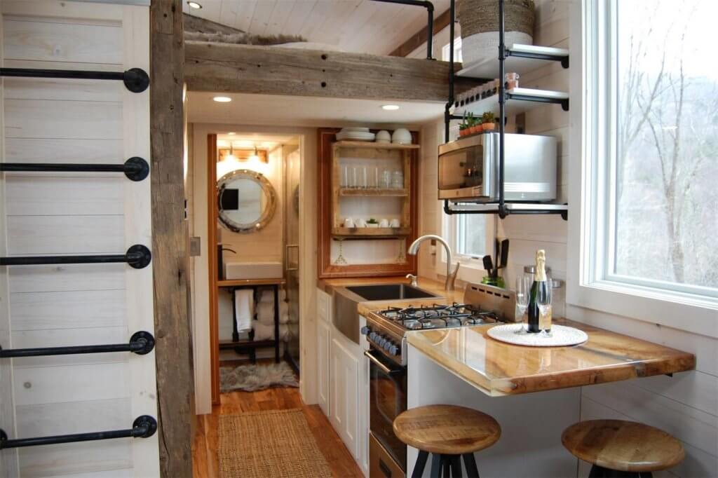 Отличным решением будет расположение барной стойки, что не занимает много пространства и в тоже время отпадет необходимость приобретать огромный обеденный стол. Маленькая угловая кухня с расположенной внутри барной стойкой, станет наилучшим вариантом для малогабаритных помещений.