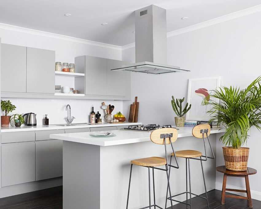 Светлая кухня визуально кажется больше и просторнее. Для отделки стен в данном случае идеально подойдут белый, все оттенки бежевого, пастельные и приглушенные тона любых цветов.