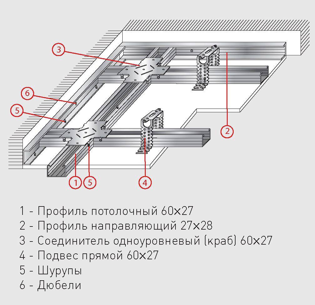 Чтобы смонтировать качественный и надежный каркас под гипсокартонный потолок, кроме крепкого крепления к стенам и потолку необходимо наличие надежного соединения профилей между собой в одно целое.