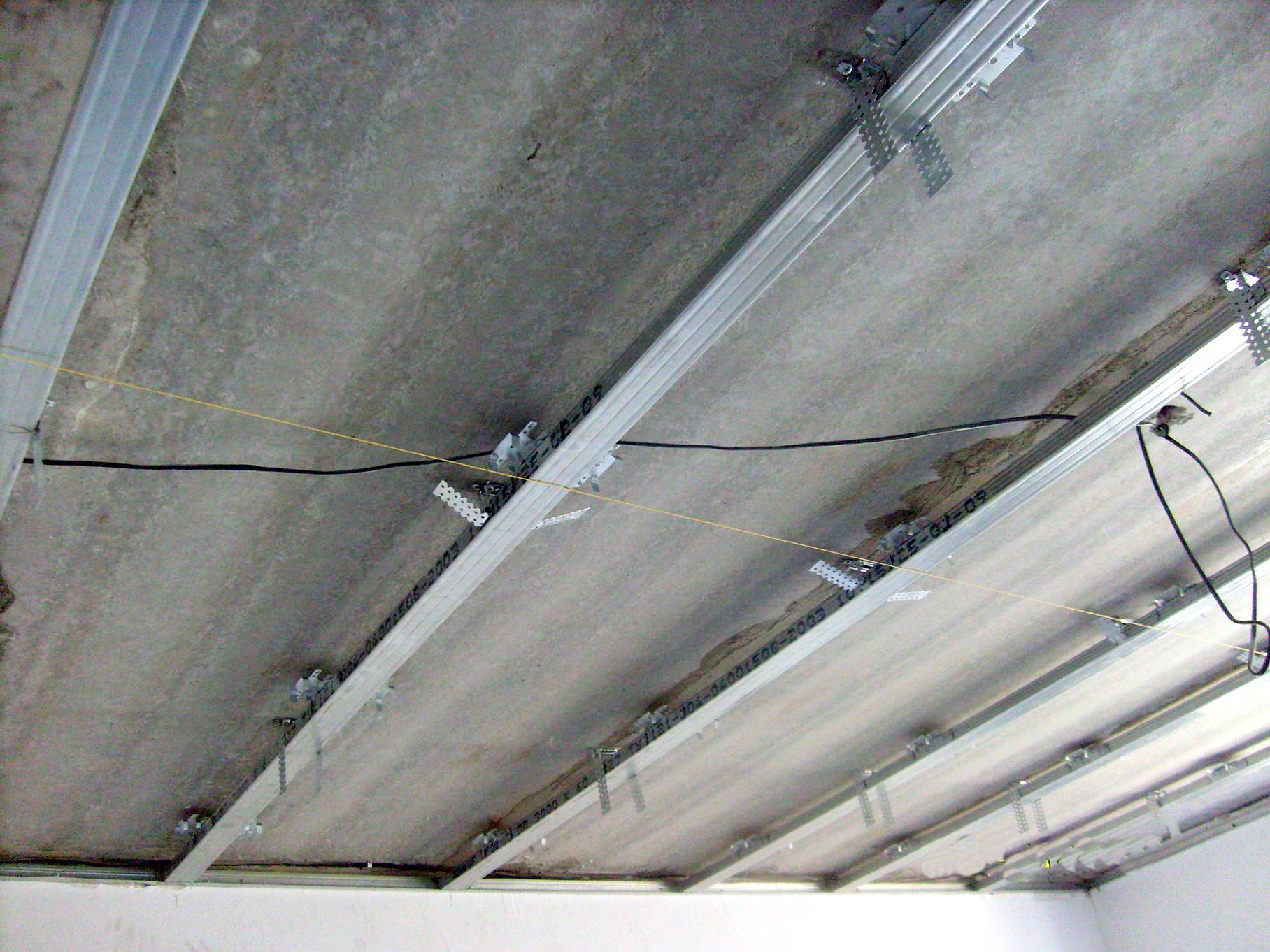 После окончания работы с подвесами необходимо смонтировать стартовый профиль для гипсокартона. Далее поперёк потолка прибиваем металлические полосы с шагом примерно 40 см, они будут использоваться в качестве несущего профиля. Поверх полос кладём продольные металлические профили, необходимые для правильного монтажа гипсокартонных потолков.