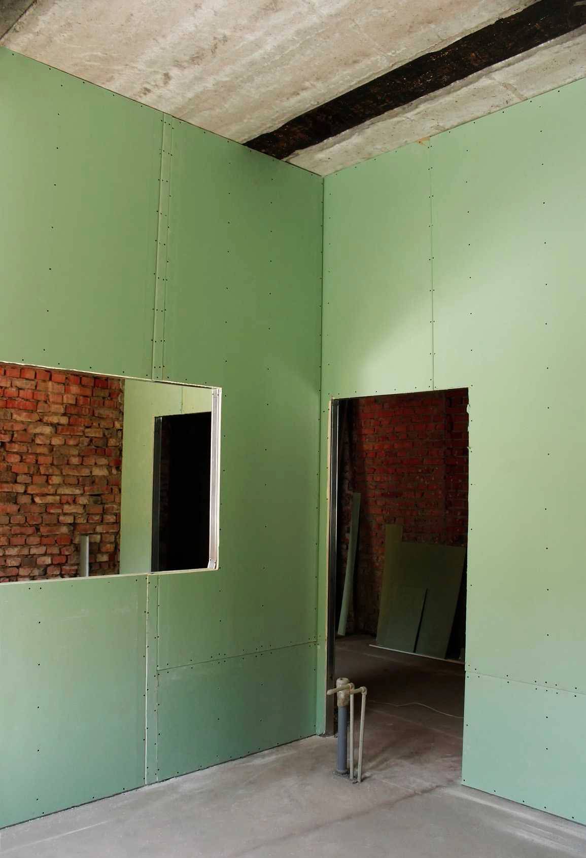 В дверных проёмах ставятся две стойки по краям проёма, а между стойками устанавливается направляющий профиль в качестве перемычки, соответствующий по длине расстоянию между ними. Он крепится на язычок к стойкам. Над ним обычно монтируется одна дополнительная стойка или несколько, до потолка, чтобы обеспечить крепление листов.
