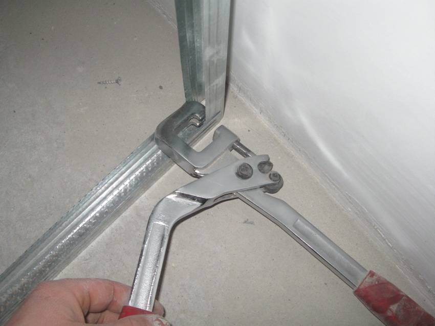 Затем ручки просекателя разводятся в разные стороны, и можно переходить к следующему скреплению. Необходимо отметить, что просекатель настолько прочно соединяет профиль для ГКЛ, что впоследствии конструкция способна выдержать повышенную нагрузку.