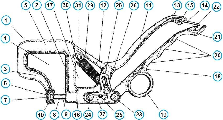Устройство просекателя профиля: 1 — скоба, 2 — первая ножка, 3 — вторая ножка, 4 — проем скобы, 5 — основание скобы, 6 — упор, 7 — углубление, 8 — рабочий зазор, 9 — пробойник, 10 — рабочий конец, 11 — неподвижная ручка, 12 — основание неподвижной ручки, 13 — свободный конец неподвижной ручки, 14 — петля, 15 — ограничитель хода петли, 16 — рама, 17 — проем рамы, 18 — подвижная ручка, 19 — кольцо, 20 — свободный конец подвижной ручки, 21 — зацеп, 22 — неподвижная ось, 23 — первая подвижная ось, 24 — вторая подвижная ось, 25 — третья подвижная ось, 26 — соответствующие отверстия, 27 — вторая направляющая прорезь, 28 — коромысло, 29 — первый конечный виток, 30 — второй конечный виток, 31 — скрепляемые детали