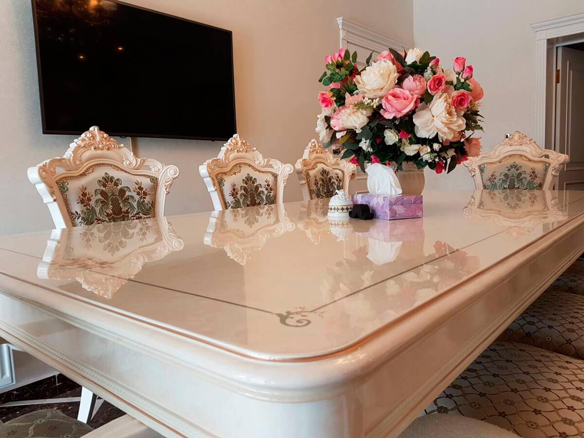 Важно, чтобы края прозрачной скатерти-пленки из ПВХ Мягкое стекло не выступали за пределы стола, иначе покрытие можно будет случайно зацепить