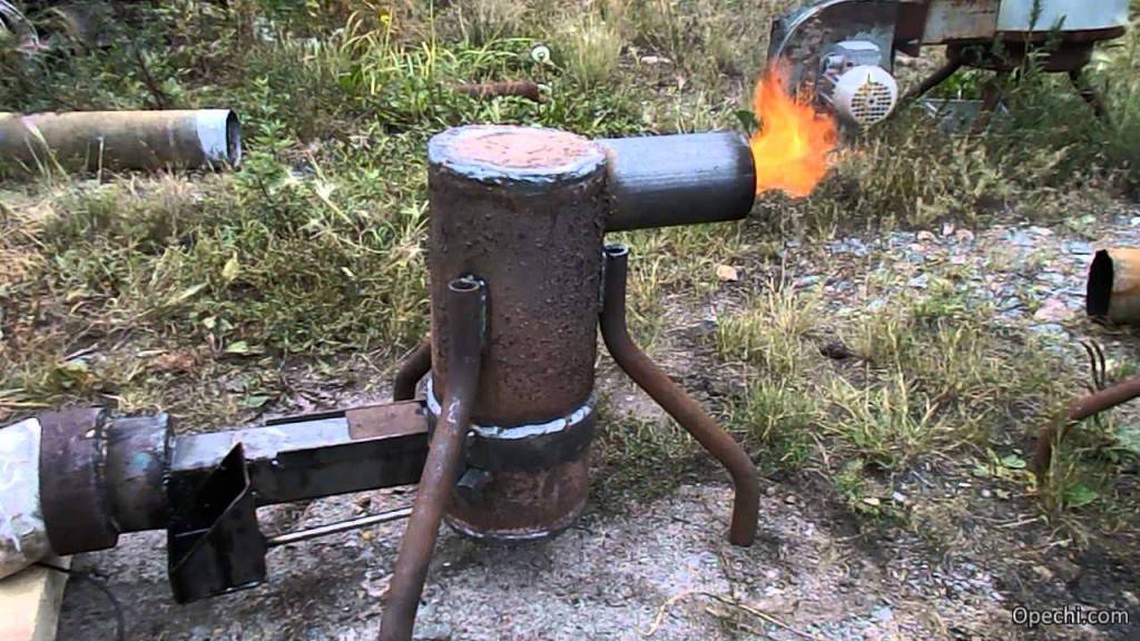 Для увеличения мощности получившейся системы, к основанию трубы, подающий воздух в топку, можно подключить нагнетатель. Им может быть старый пылесос или любой вентилятор, подходящих габаритов. Это создаст избыточное давление в камере сгорания и увеличит температуру поверхности купола.