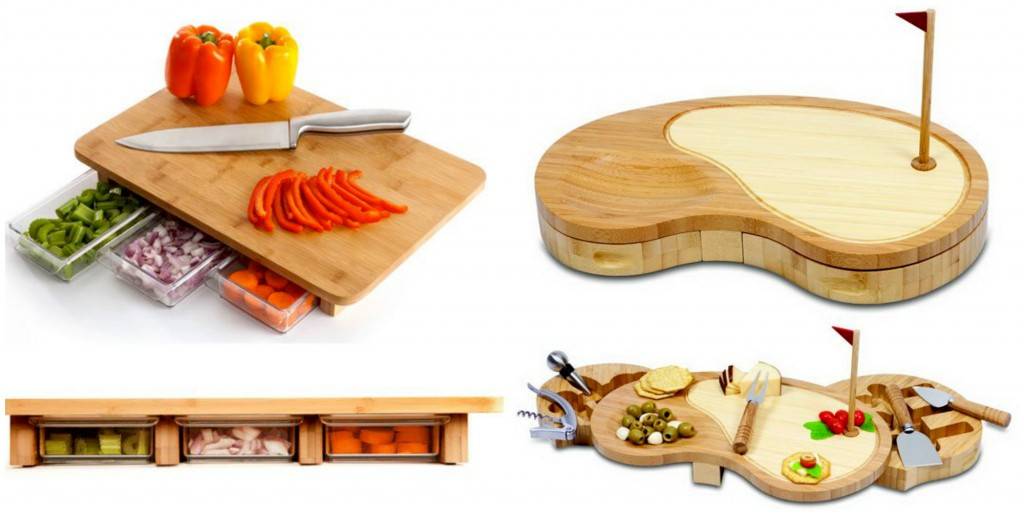 Например, доски с отверстиями, куда можно сбрасывать очистки от овощей. Или доски с вмонтированными контейнерами, куда ссыпаются нарезанные ингредиенты блюд. Так же необычны изделия с встроенными отверстиями для хранения ножей и других приспособлений для разделки продуктов.