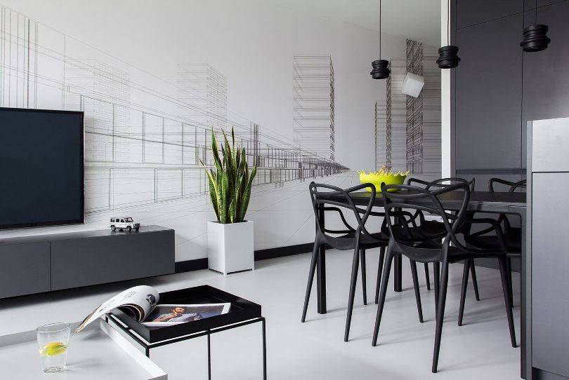 Стены в теплой гамме станут идеальным решением для узких и слабо освещенных помещений. Столовые зоны в темном формате, а также пространство в нейтральной монохромной гамме можно оформить и в светлой комнате.