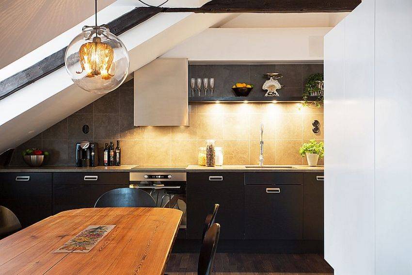 Чтобы сделать кухню более разнообразной, создать особую атмосферу и стиль, при проектировке часто применяется навесная мебель, которая имеет разные размеры и высоту. Такая комбинация позволяет сделать низкие шкафы своеобразными полками. Они декорируются различными статуэтками, вазами. Особую атмосферу поможет придать локальная подсветка. Идеальная высота кухонных шкафов от столешницы – 60 см.