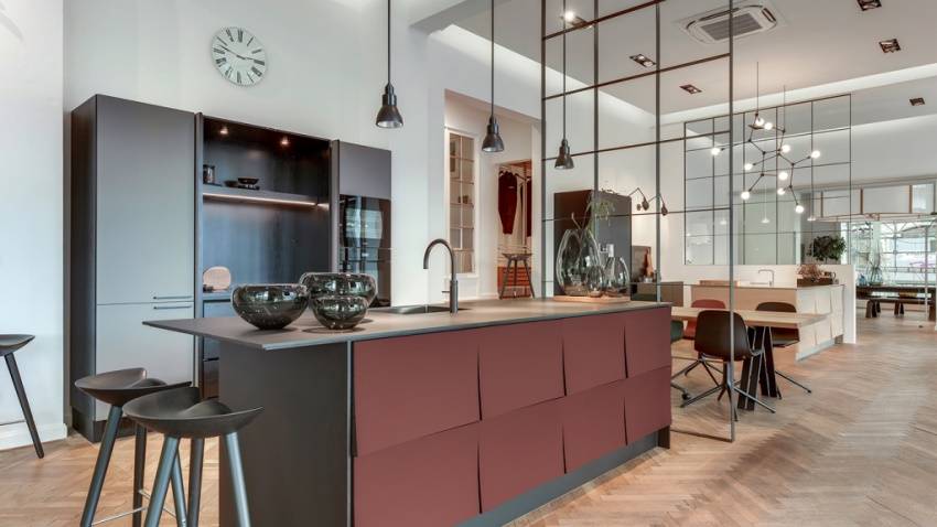 В роли разграничителя может выступать модуль в центре комнаты. Например, напольные шкафы со встроенной плитой и столешницей. Длина зависит от площади помещения и функциональных особенностей. Высота может быть выше, чем стандартный габарит 85-90 см.