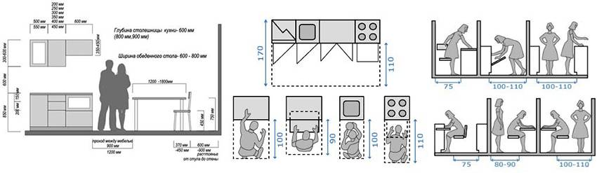 Именно поэтому при расчетах стандартных размеров кухонного гарнитура ученые инженеры руководствовались средними антропометрическими характеристиками людей европеоидной расы, которые включают рост тела в покое и в процессе выполнения определенных движений: наклонов, приседаний, вытягивания рук в ширину и высоту. Исходя из этих расчетов, были определены и стандартные габариты кухонных гарнитуров и бытовой техники.