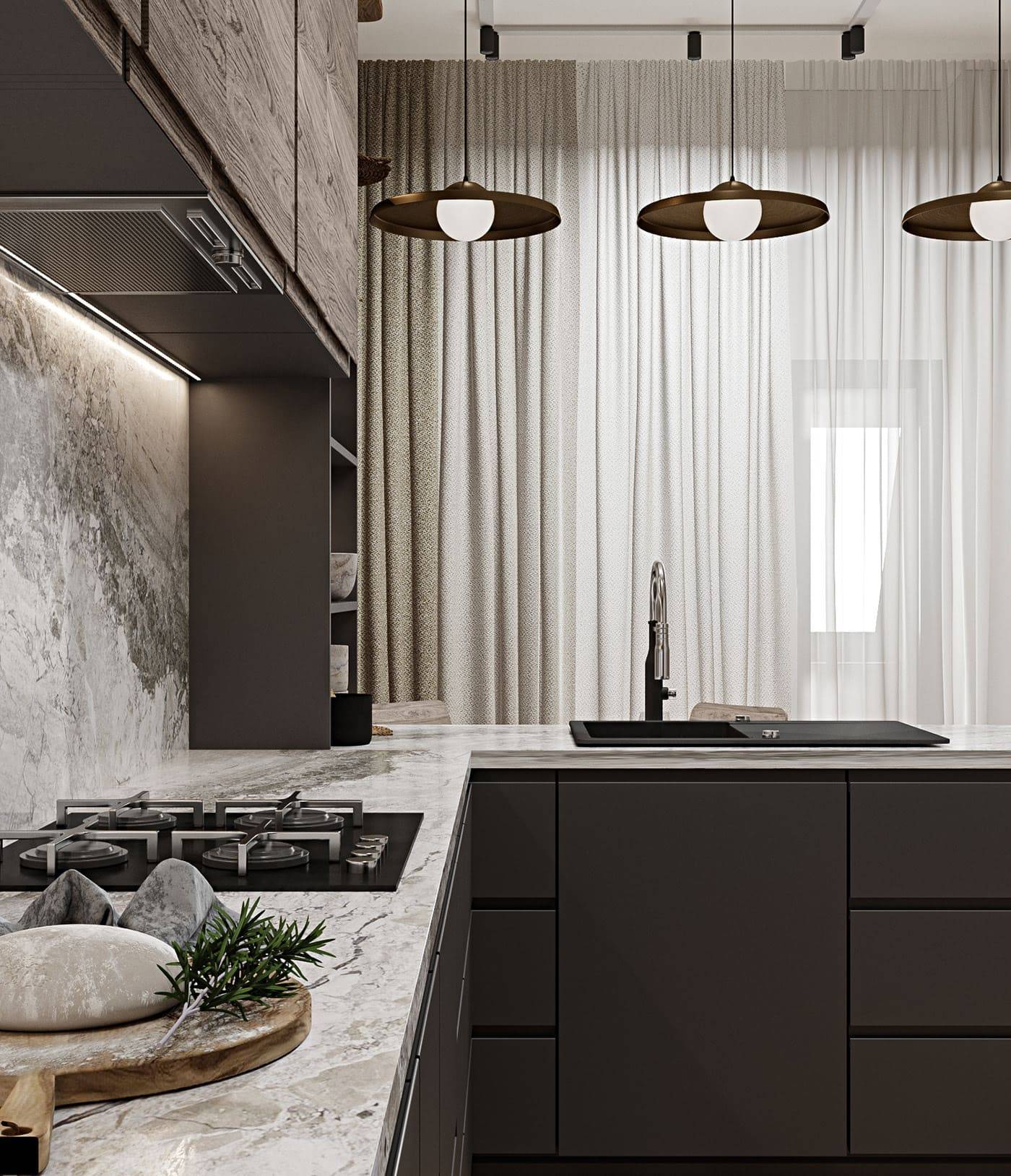 - Имейте в виду, что при наличии газового котла на кухне и вытяжки с отводом в вентиляцию вы будете привязаны в проектировании к расположению вентиляционного канала и газовых труб.