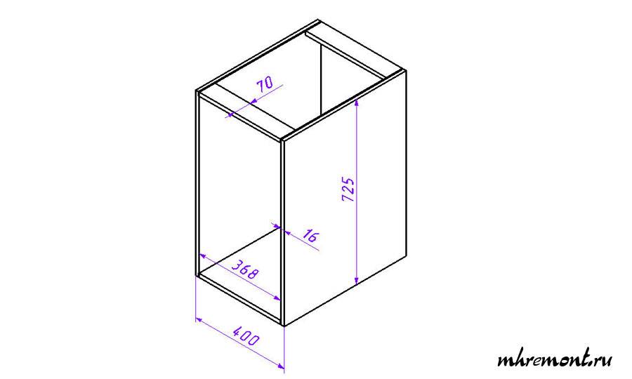 Шкаф для варочной поверхности несколько отличается от обычного. Все дело в способе крепления самой варочной поверхности. Установка варочной поверхности предусматривает максимальную толщину основания 40 мм, т.е. толщину стандартной столешницы. Поэтому если сделать ящик стандартный, то закрепить варочную поверхность очень проблематично. В этом случае следует поступить следующем образом. Необходимо в место верхней стенки ящика использовать две планки. Тогда с одной стороны обеспечится жесткость ящика, а с другой верхняя часть ящика не будет мешать креплениям варочной поверхности. Так же для этого типа ящика можно не делать заднюю стенку для лучшей вентиляции.
