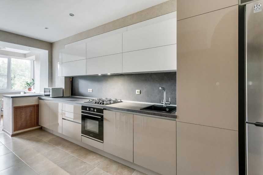 Глянец здесь присутствует во всем – фасады, стеклянный кухонный фартук, пленочный натяжной потолок, хромированные ручки мебели, опорные элементы барной стойки, сетчатые полочки.