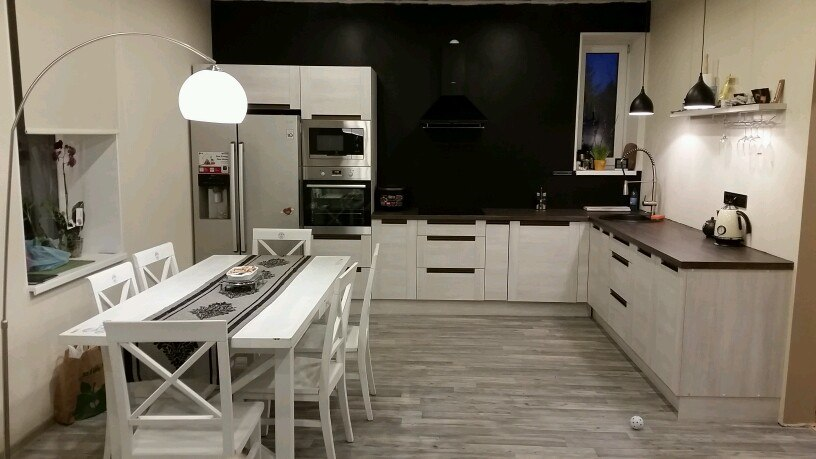 Отдельные любители покрывают одну или все стены кухни черной декоративной штукатуркой, грифельной краской, размещая на таком фоне беленький гарнитур, не имеющий закрытых верхних шкафчиков. Сверху имеются только открытые полки, также окрашенные в темные тона, потому совсем незаметные. Такое оформление хорошо смотрится в П-образной, G-образной кухне, так как немного белого присутствует вдоль всего пространства.