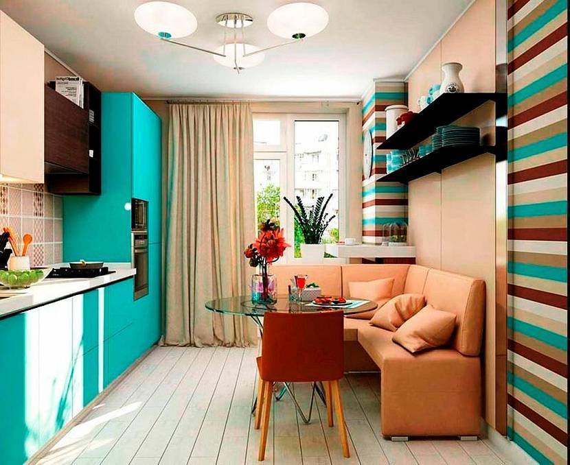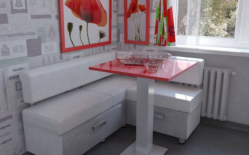 На кухне на 8 кв. используют компактный мягкий уголок. Мебель располагают рядом с окном и гарнитуром (рабочей зоной). Чтобы увеличить полезную площадь, нужно демонтировать подоконник. У модели больше посадочных мест, чем у традиционного дивана. Рядом ставят стол-трансформер.