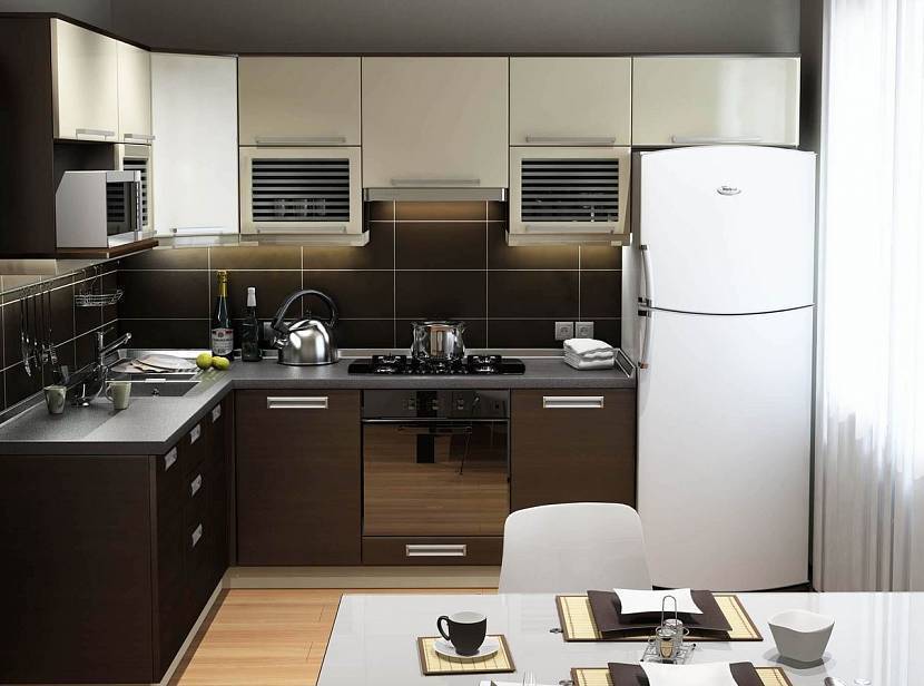 Этот вариант расположения кухонной мебели наиболее распространен при дизайне маленькой кухни. Он создает эргономичный рабочий треугольник, позволяющий удачно разместить мойку, плиту и холодильник. При этом расстояние между этими тремя важнейшими кухонными элементами будет наиболее выигрышным. Фото угловых гарнитуров для малогабаритных кухонь 7 кв. м с наиболее удачным расположением холодильника, можно увидеть далее.