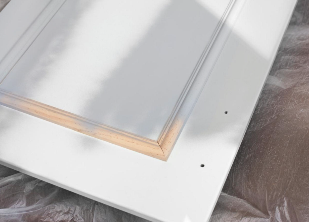 - Обновляемый фасад снимают с петель, удаляют фурнитуру. Весь старый слой отделки тоже необходимо удалить. Эмаль и лак снимают с помощью растворителя, ПВХ-пленку сильно нагревают и так далее. При необходимости зачищают поверхность створки наждачной бумагой.