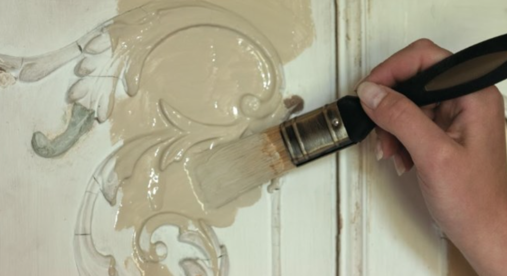 После высыхания обновляемую створку грунтуют. Можно использовать кисть или краскопульт. - После высыхания – около 1 часа, окрашивают изделие. Если, кроме молдинга, крепят и резные элементы, их лучше окрасить кисточкой, покраску рекомендуется повторить.