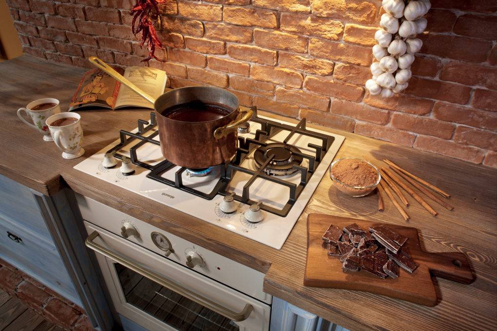 Для оформления зоны готовки нужно подобрать типажную вытяжку, варочную поверхность и духовой шкаф встраиваемого типа, стилизованные под портал камина. Комплекты бытовой техники со схожим дизайном оформления выпускают многие производители. В зоне готовки все кулинарные инструменты и мелкая бытовая техника должна быть скрыта от посторонних взглядов. На виду должны быть лишь коллекции антикварной посуды, размещенные на открытых полках гарнитура.