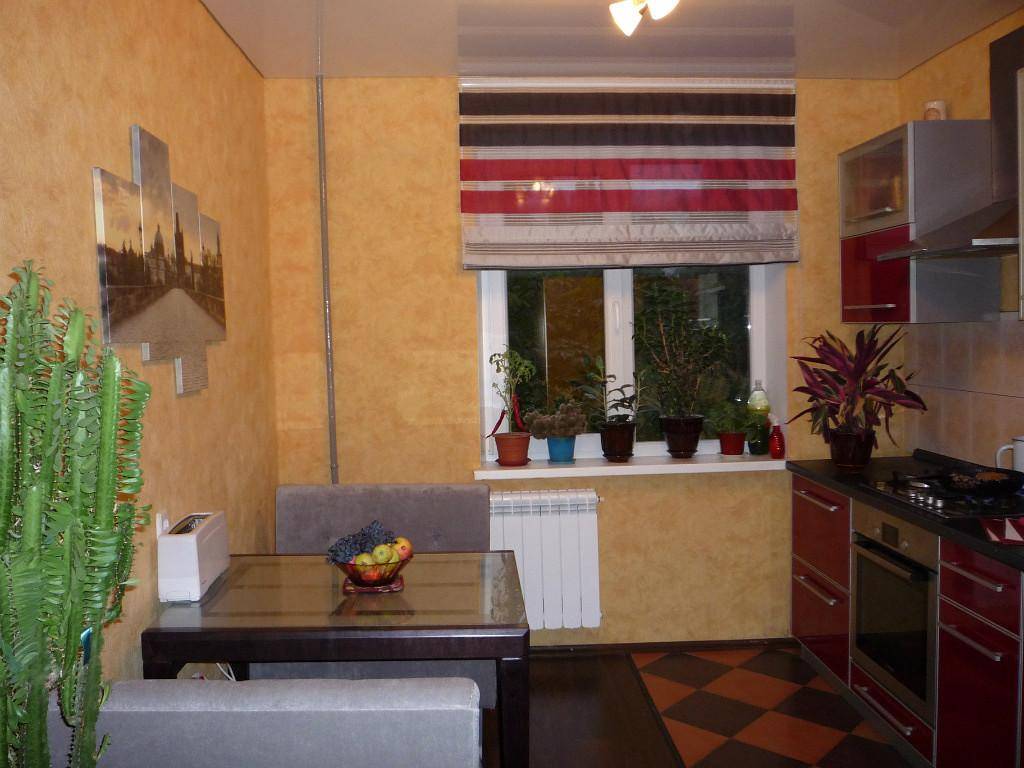 Красными римскими шторами можно оформить кухню в таких стилях: