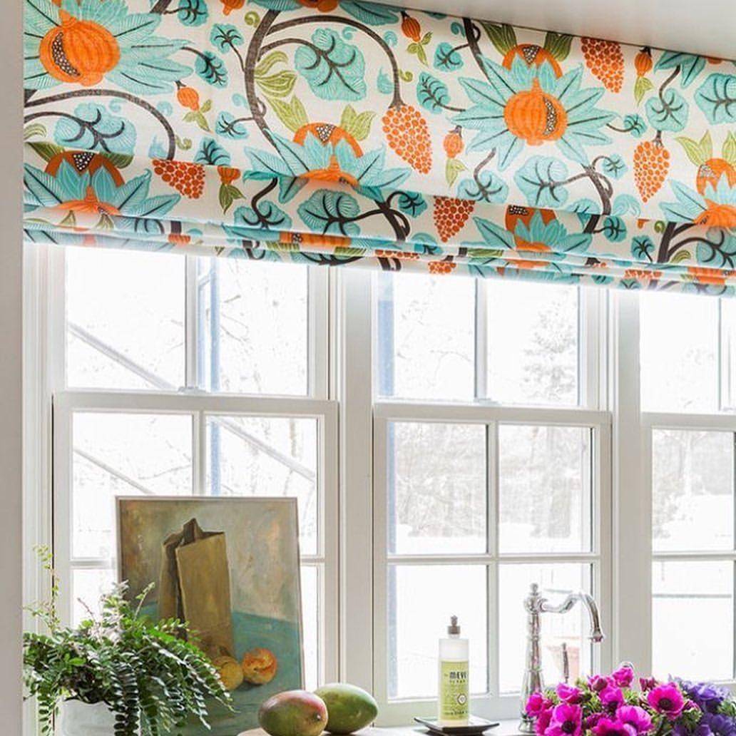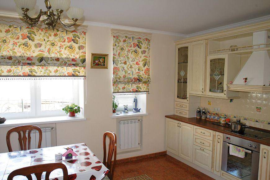Модная новинка – римские шторы с крупным принтом. Они подойдут для кухни любого размера. Единственное ограничение ― шторы в небольшом помещении не должны быть слишком пестрые и яркие. Для создания необычного свежего образа будет достаточно одного фонового цвета и контрастного к нему рисунка, составленного из одного или двух цветов.