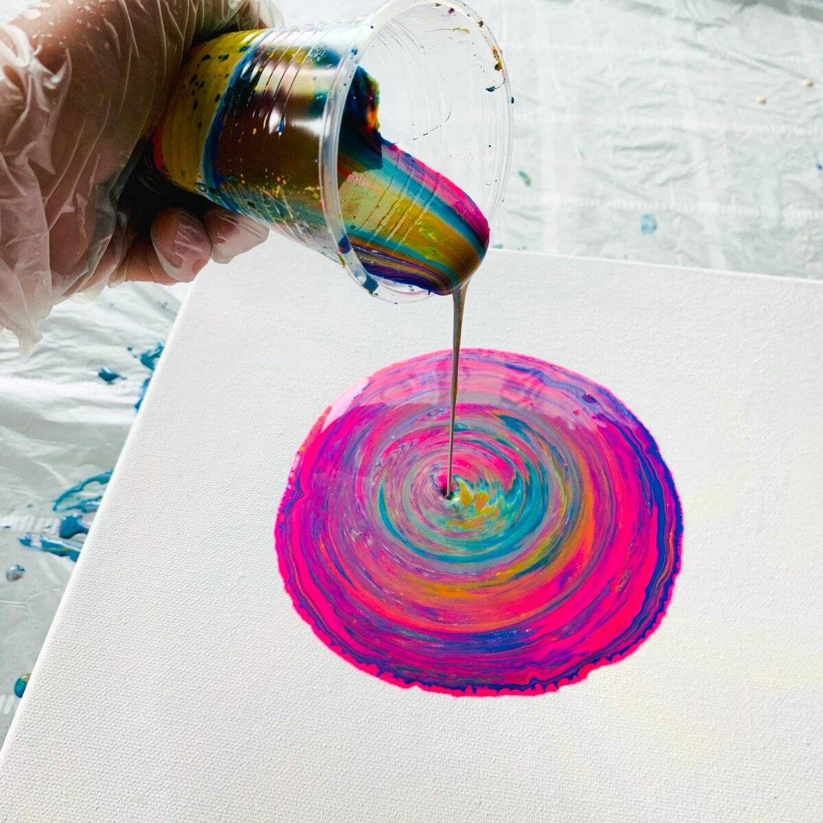 Есть несколько техник, которые используются для заливки жидким акрилом. Одна из них заключается в том, что краски последовательно слоями заливаются в стакан или какую-то другую емкость, а затем тонкой струйкой в одну точку выливаются на холст, расплываясь по нему невероятными узорами.