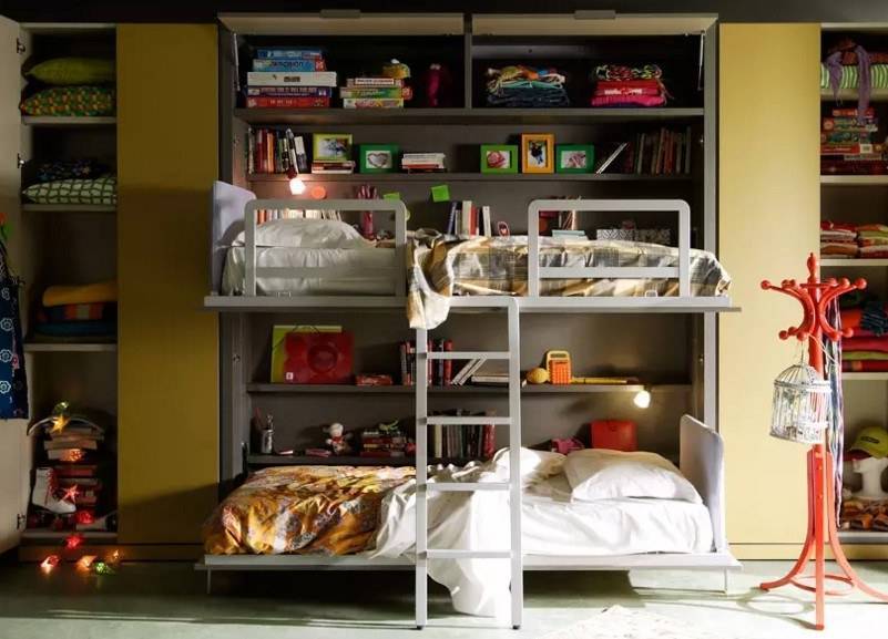 Кровати-трансформеры с откидным, выдвижным спальным местом или переворачивающейся кроватью, превращающейся в стол.
