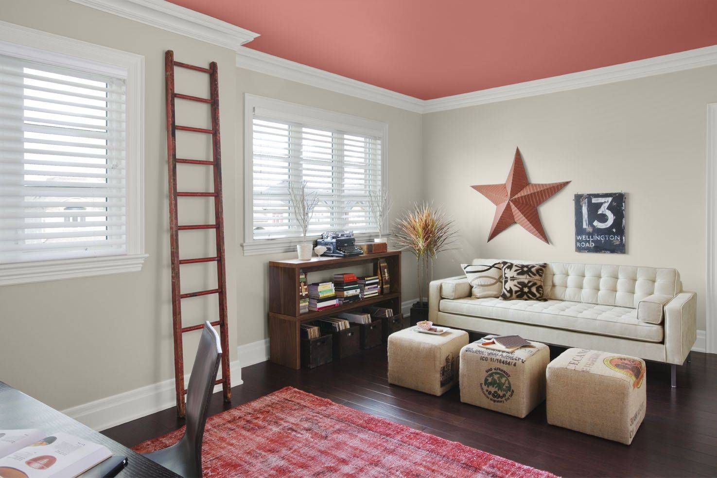 Краску тоже можно отнести к недорогим вариантам оформления поверхностей. В отличие от обоев этот материал устойчив к влаге, поэтому потолок во время уборки можно мыть;