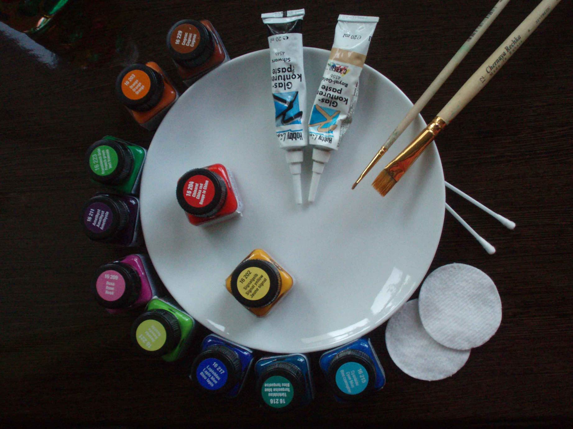 Роспись витражными красками обычно не вызывает сложности. Можно доверить этот процесс детям, превратив его в веселое развлечение для всей семьи. Необязательно уметь рисовать, достаточно распечатать необходимые трафареты. Для работы над витражом вам могут пригодиться следующие предметы: