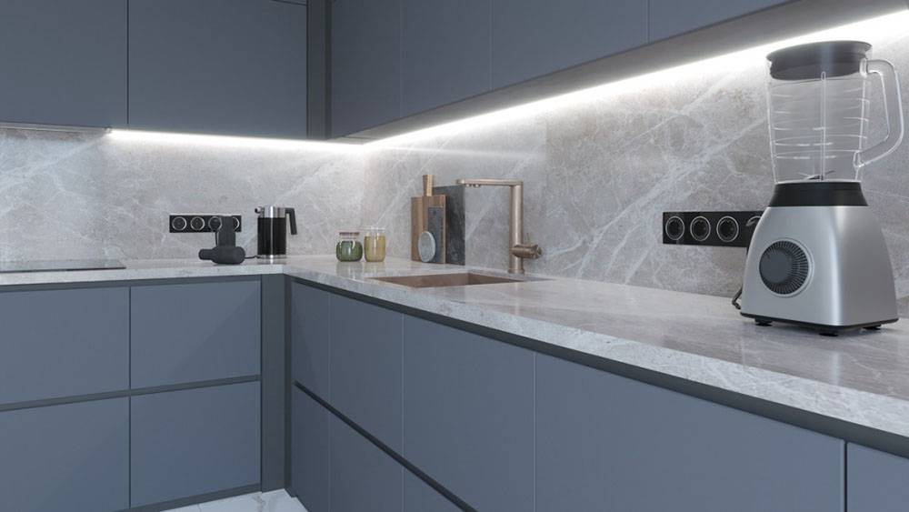 Розетки на фартуке обычно задействуют под малогабаритную технику: электрический чайник, измельчитель и подобные приборы. От их числа зависит нужное количество гнезд.