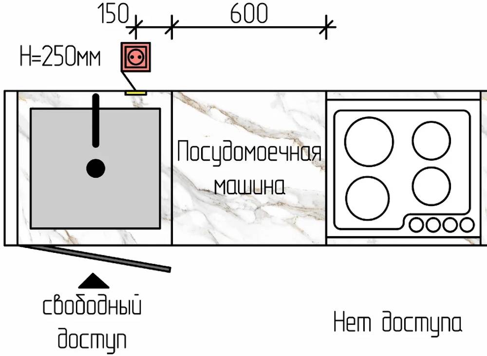 Посудомойка часто размещается возле раковины в силу удобства поставки воды. Но монтировать гнездо прямо под мойку не стоит: есть шанс, что туда попадет вода. Лучше расположить его в шкафчике, расположенном по соседству