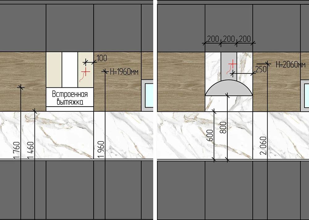 Этот аппарат забирает запахи из кухни. Для вытяжки розетку лучше устанавливать наверху, над кухонными шкафами. Стандартного расстояния от вытяжки до энерготочки нет – этот показатель определяется домовладельцами. Однако, лучше, чтобы розетка находилась рядом с вытяжкой. Параметры высоты для всех типов кухонь в этом случае следующие: