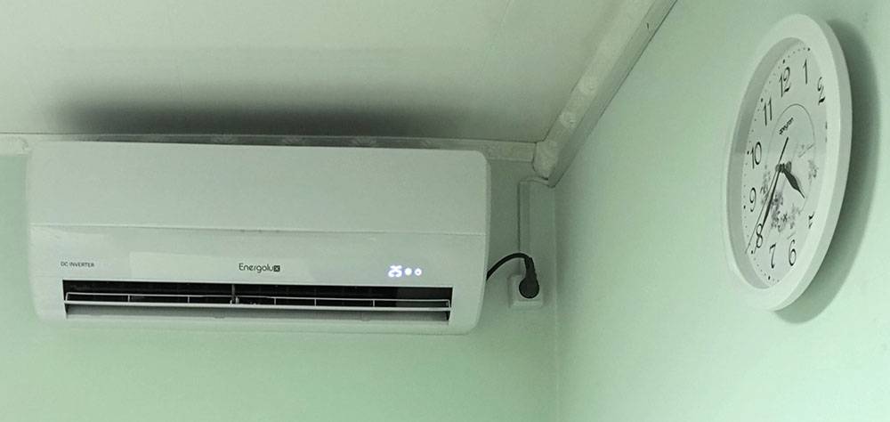 Обычно кондиционер подключается от отдельного провода и автомата, без розетки. При необходимости энерготочку ставят около прибора с расстоянием от потолка в тридцать сантиметров. Кабель при этом не должен натягиваться.