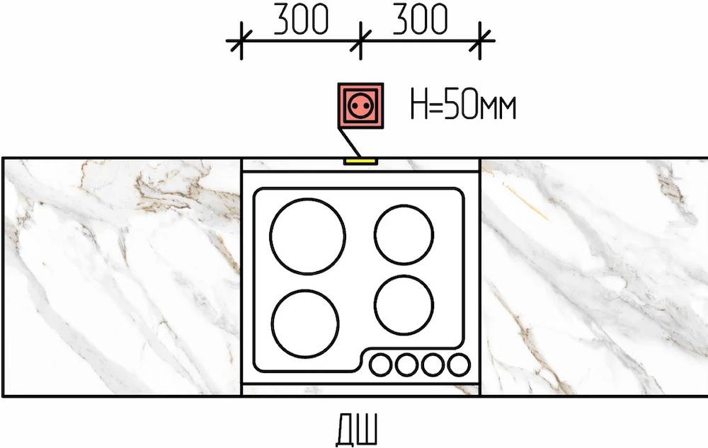 Розетка для варочной панели и духового шкафа должна располагаться минимум в 0,3 м слева или справа от панели или плиты. Также важна дистанция от гнезда до труб газопровода (минимальная – 0,4 м). Если духовой шкаф и варочная поверхность не объединены в одно устройство, их подключают в разные розетки. Они могут находиться в соседнем шкафу или в нижней части кухни не менее чем в 0,3 м от пола.