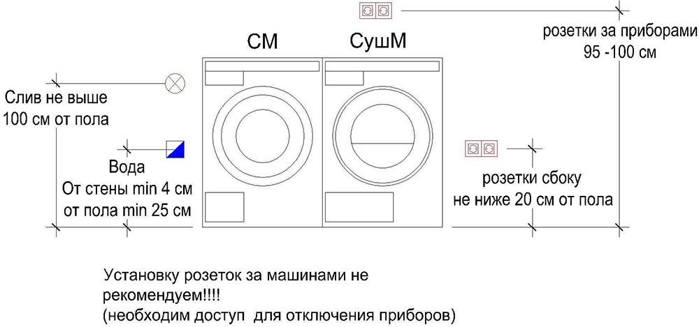 Все то же самое касается размещения гнезда для стиральной машины.
