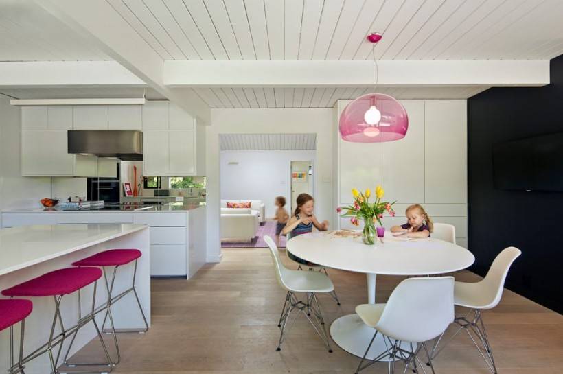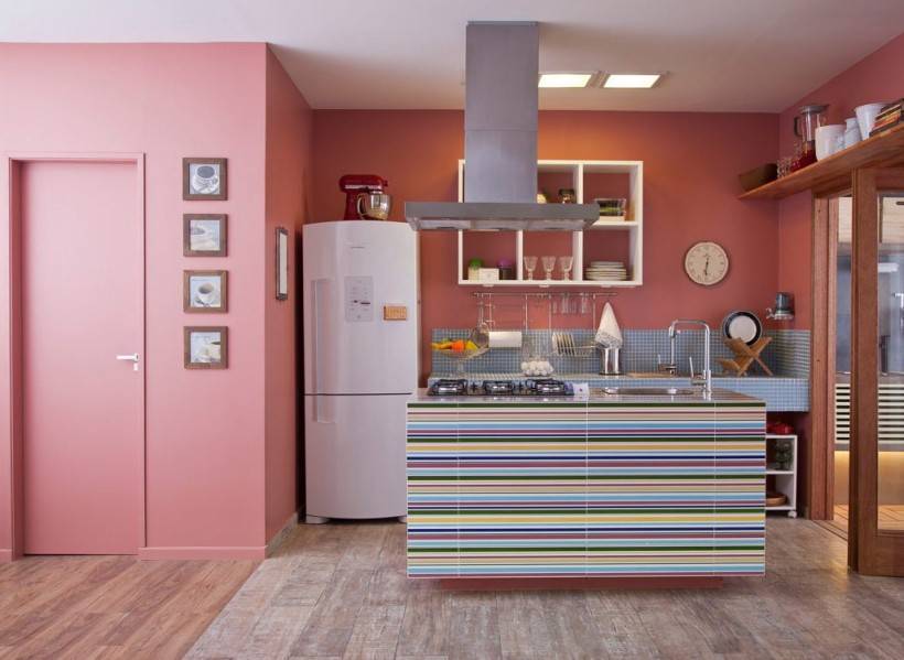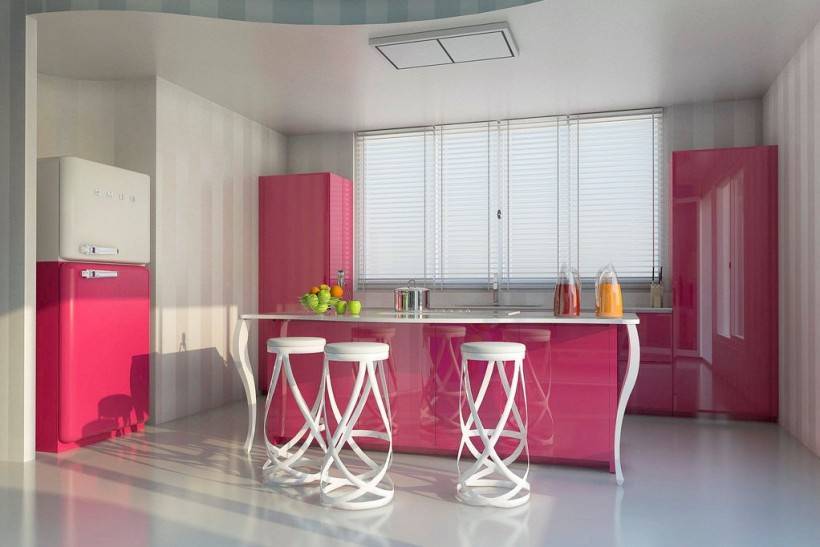 Карминовый либо наоборот нежно-розовый в сочетании с белым, черным или голубым, оранжевым – впишутся в интерьер кухни в стиле ретро или поп-арт как на этих фото.